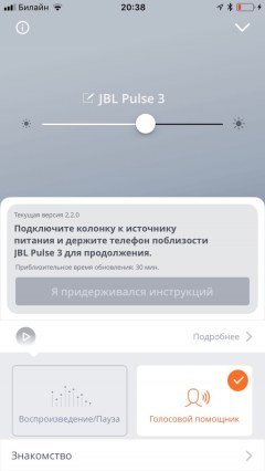 При соединении со смартфоном у пользователя есть возможность управления устройством с помощью фирменного приложения JBL Connect. Оно пригодится для обновления прошивки, редактирования цветовых схем, смены режимов подсветки и ее яркости, а также настройки технологии Connect+, с помощью которой можно синхронизировать до 1000 аудиоустройств одновременно, создав «звуковое поле» впечатляющих масштабов. Стоит упомянуть, что «захват цвета», реализованный в Pulse 2 с помощью камеры и отдельной кнопки, в новой версии доступен в приложении и работает гораздо точнее — в Pulse 2 камеру приходилось подносить вплотную к поверхности с желаемым цветом.