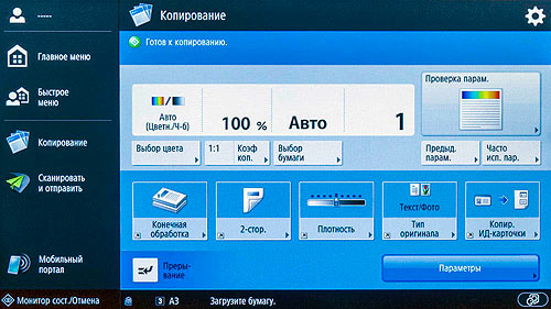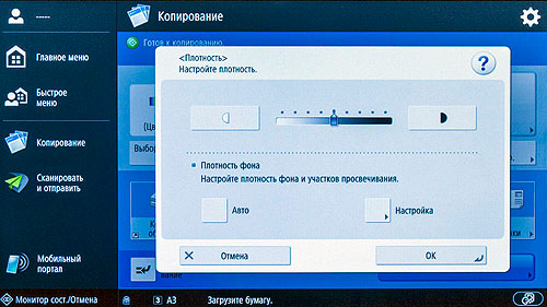 Копии можно нумеровать и дооснащать «водяными знаками», есть точная настройка цветопередачи; полный набор доступных параметров копирования занимает в меню целых четыре страницы, однако отметим: не все доступные функции можно сочетать друг с другом.