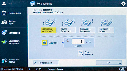 Финишные функции: если делается несколько копий многостраничных документов, то задание сортировки/группировки — дело вполне обычное для всех печатающих устройств, но разделять комплекты потом приходится вручную. В имеющемся финишере можно задать разделение сдвигом: четные и нечетные комплекты в лоток финишера выходят со сдвигом в пару сантиметров.