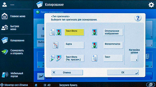 Для автоматической оптимизации изображения на копии можно задать тип оригинала: текст, текст/фото, фото, карта, отпечатанное изображение — с этим всё понятно, и есть еще установка «Текст/фото (ум.просвеч.)» — то есть уменьшение просвечивания в случаях, когда оригинал двусторонний, а его бумага тонкая, и видно напечатанное на обратной стороне.