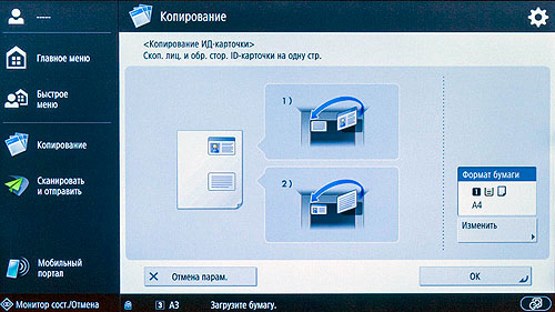 Как во многих современных МФУ, есть режим копирования ИД-карт — небольшого размера двусторонних или многостраничных документов. С его помощью, например, очень удобно копировать два разворота паспорта на один лист.