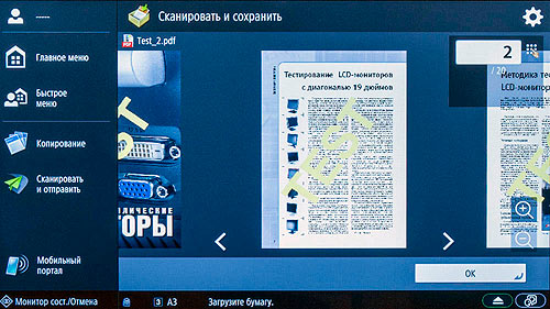 OOXML — это форматы сохранения офисных документов, например, для приложений MS Office. Доступны два: DOCX и PPTX, и самое интересное: скан может сохраняться не как картинка, вставленная в документ MS Word или PowerPoint, а как доступный для редактирования и поиска текст — встроенная система распознавания символов (OCR) работает даже с русским языком. То же относится и к сохранению в формате PDF с возможностью поиска. В нашей лаборатории уже были МФУ, поддерживающие распознавание, вот только русского языка они не понимали.