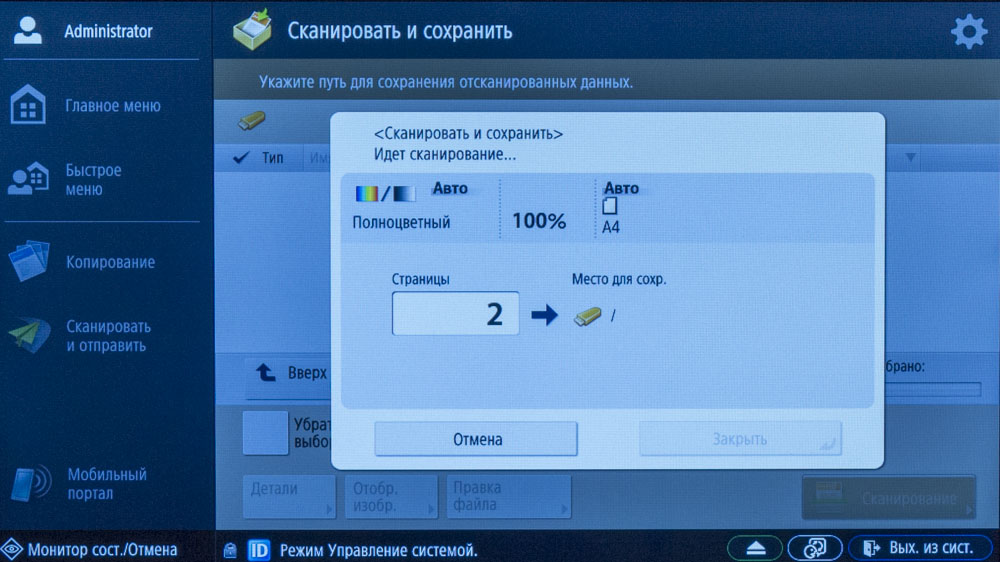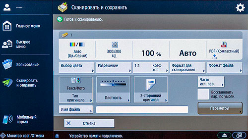 Вторая функция, доступная при работе с флэшкой — сканирование с сохранением результата на нее. Остановимся на этом подробнее, поскольку при сохранении сканов на сетевые ресурсы возможности будут теми же.