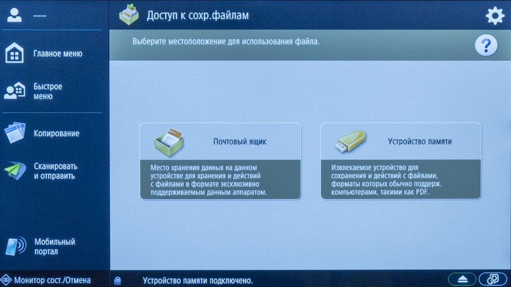 Отдельной иконки на домашней странице нет, используется функция «Доступ к сохр. файлам», где имеется выбор между почтовым ящиком (местом хранения файлов на МФУ) и устройством памяти (в том числе подключенной флэшкой). При подключении USB-носителя в нижней правой части экрана появляется иконка для безопасного извлечения (на скриншоте показана стрелкой), которой, как и в компьютерах с Windows, рекомендуется пользоваться перед извлечением.