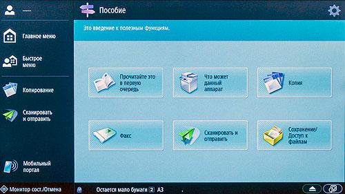 Дать максимально подробные описания процессов подключения или использования той или иной функции в рамках нашего обзора не представляется возможным, к тому же детали можно уточнить в имеющихся в свободном доступе инструкциях и других справочных материалах компании. Кроме того, некоторые сведения имеются в «Пособии» — одном из разделов меню панели управления МФУ.