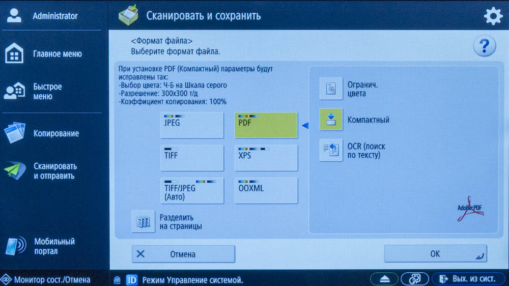 Для большинства можно еще выбрать варианты: так, PDF может быть компактным, с ограничением цвета или с возможностью поиска по тексту. Но выбор формата или «субформата» зачастую воздействует на другие настройки: например, для компактного PDF нельзя выбрать разрешение 600×600 dpi, а в TIFF можно сохранить только черно-белые сканы.