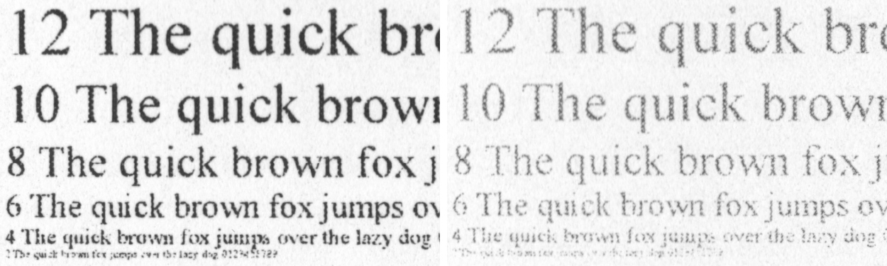 Копии текстового оригинала, уверенная читаемость на котором начинается со 2-го кегля, получаются очень приличными: можно даже разобрать 2-й кегль шрифта без засечек, хоть и с трудом, а 4-й кегль в любом случае читается хорошо.