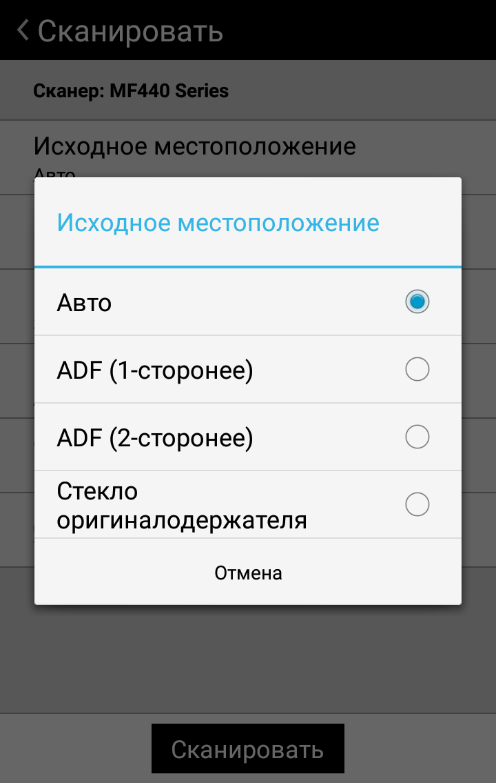 Нажатие экранной кнопки «Сканирование» сначала предлагает выбрать адресата для будущего файла скана, сейчас нам интересно «Устройство памяти USB».