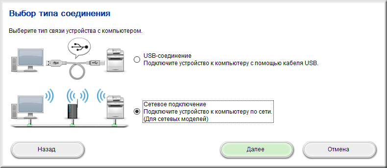 Во время установки ПО задаем тип подключения — сетевое, причем без уточнения: проводное или Wi-Fi.