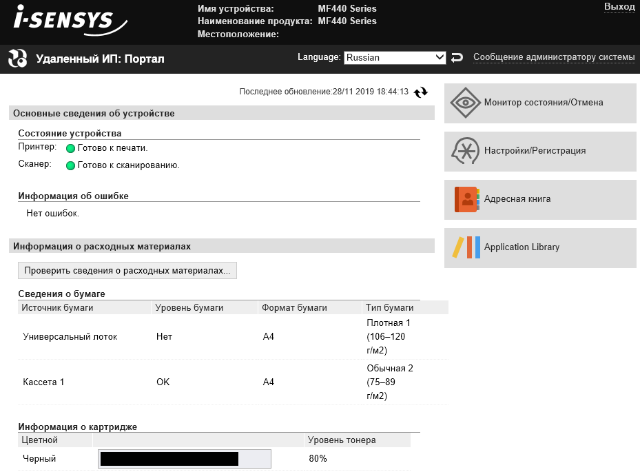 Могут отображаться и страницы с информацией о состоянии аппарата — например, о расходных материалах: