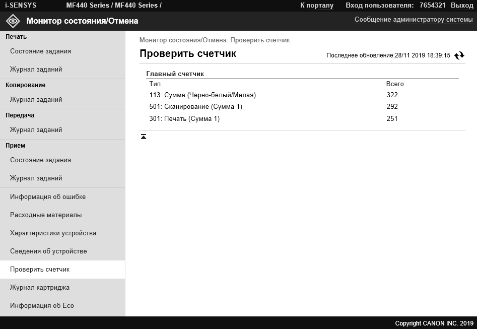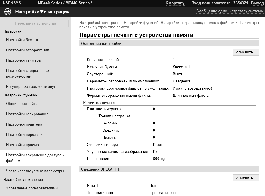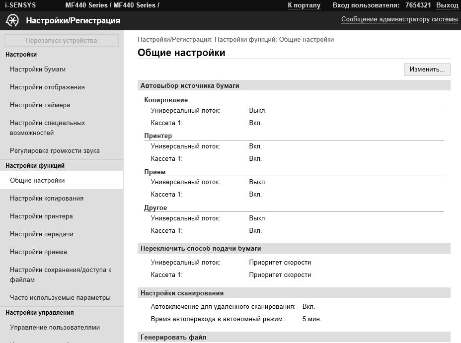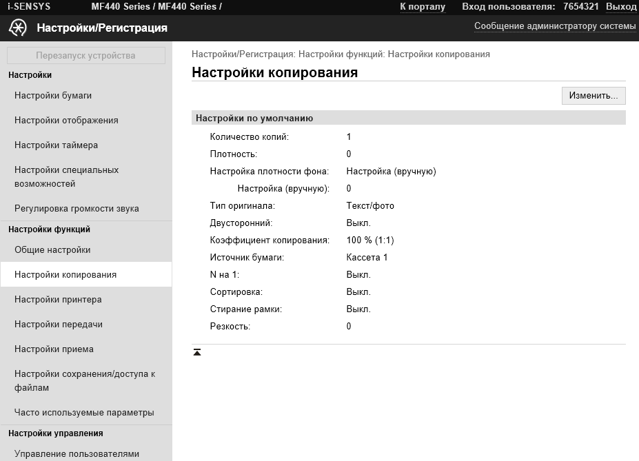 Доступ к некоторым настройкам может потребовать ввода ИД администратора и пароля. Оба значения должны быть чисто цифровыми, сведения об установках по умолчанию есть в инструкции пользователя: ИД и пароль одинаковые — 7654321.